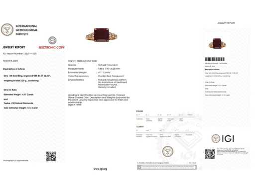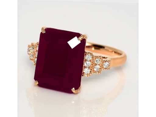Luxe Design Ring Natuurlijke Paarsrode Robijn 4,25 karaat in 14 karaat witgoud van 3,29 gr met een smaragdvormige rode robijn van 4,11 karaat en 12 ronde briljante natuurlijke diamanten van 0,14 karaat. Gecertificeerd door IGI, een van 's werelds grootste onafhankelijke edelsteencertificerings- en taxatieinstituten. Meer informatie zie het certificaat. De sieraden zijn in werkelijkheid beter dan de foto's. Winkelprijs: € 9.850.-