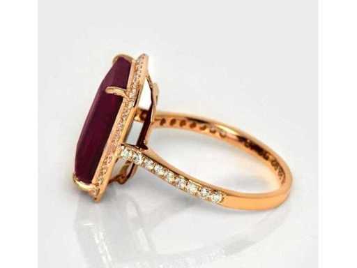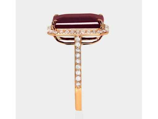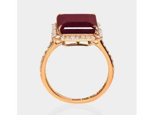 Luxe Ring Natuurlijke Paarsrood Robijn 7,17 karaat in 14 karaat roze goud van 3,61 gr met een smaragdvormige paarsrode robijn onverwarmd van 6,77 karaat en 46 ronde briljante natuurlijke roze diamanten van 0,40 karaat. Gecertificeerd door IGI, een van 's werelds grootste onafhankelijke edelsteencertificerings- en taxatieinstituten. Meer informatie zie het certificaat. De sieraden zijn in werkelijkheid beter dan de foto's. Winkelprijs: € 11.850.-
