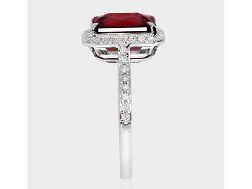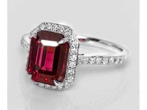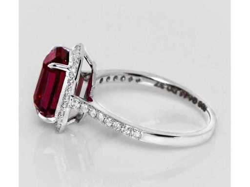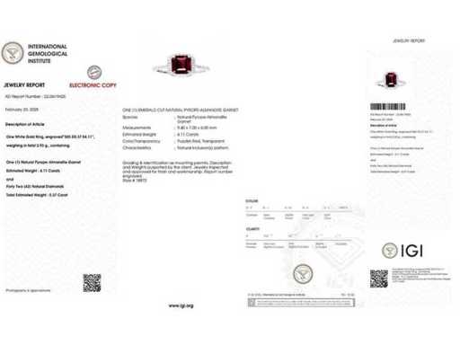 Luxe ring van hoogwaardige natuurlijke granaat Purperish Red 4,48 karaat in 14k witgoud, totaalgewicht 2,93 gr. Centrale steen een natuurlijke Garnet Purpurish Red in smaragdgeslepen 4,11 karaat met 42 ronde briljante diamanten van 0,37 karaat. Gecertificeerd door IGI Labaratoire, een van 's werelds grootste onafhankelijke certificerings- en evaluatieinstituten voor edelstenen. Meer informatie zie het certificaat. De sieraden zijn in werkelijkheid beter dan op de foto's. Winkelprijs: € 9.950.-