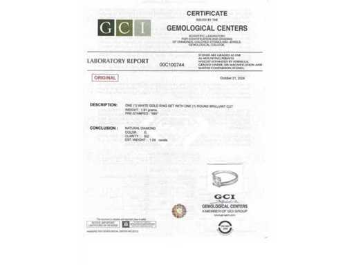 Luxe solitaire ring in natuurlijke diamant 1,09 karaat in 14k witgoud, totaalgewicht 1,91 gr. De centrale steen is een natuurlijke diamant in ronde briljant slijpvorming, zeer goede kleur en zuiverheid G/SI2 van 1,09 karaat. Gecertificeerd door GCI Laboratoire, een van de grootste internationale instituten voor de certificering en evaluatie van diamanten en edelstenen. Meer informatie zie het certificaat. Sieraden zijn in werkelijkheid beter dan foto's. Schattingsprijs van de winkelier: 11.950.-