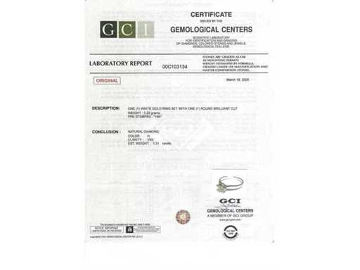 Luxe solitaire ring in natuurlijke diamant 1,31 karaat in 18k witgoud, totaalgewicht 3,29 gr. De centrale steen is een natuurlijke diamant in ronde briljant, TOP van kleur en zuiverheid H / VS2 van 1,31 karaat.. Gecertificeerd door GCI Laboratoire, een van de grootste internationale instituten voor de certificering en evaluatie van diamanten en edelstenen. Meer informatie zie het certificaat. Sieraden zijn in werkelijkheid beter dan foto's. Schattingsprijs van de winkelier: 17.550.-