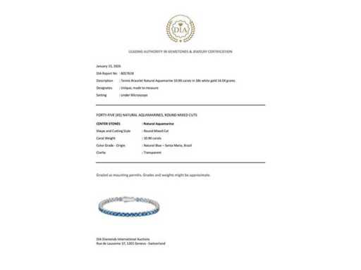 Luxe tennisarmband in Natural Santa Maria Blue Aquamarine AAAA 10,90 karaat in 18 karaat witgoud 14,04 gram, met 45 goede kwaliteit natuurlijke ronde vorm, Natural Santa Maria Blue Aquamarines 10,90 karaat. Santa Maria Blue Aquamarine werd voor het eerst ontdekt in de Santa Maria de Itabira-mijn in Menas Gerais, Brazilië, waar de originele aquamarijnedelsteen met een unieke diepe verzadigde blauwe tint werd ontdekt. Om deze reden worden aquamarijnstenen met zo'n kleur nu 'Santa Maria' genoemd, ongeacht hun herkomst. Stenen van deze zeldzame kleur behoren tot de hoogste kwaliteitscategorie. Gecertificeerd door DIA Suisse. Voor meer informatie, zie het certificaat. Het echte juweel is mooier dan de foto's. Geschatte prijs van de winkel: € 25.650.-