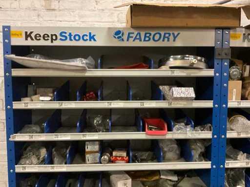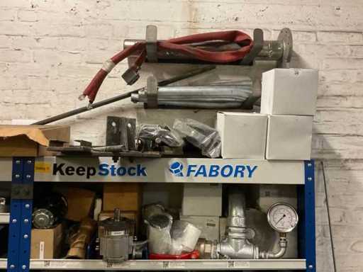 Machinetoebehoren in 2 kasten en los,bestaande uit o.a. trechterhouder, afdekplaten, steunen, bevestigingsmaterialen, dosseerders, slang etc, inclusief 2 ‘Fabory’ kasten.