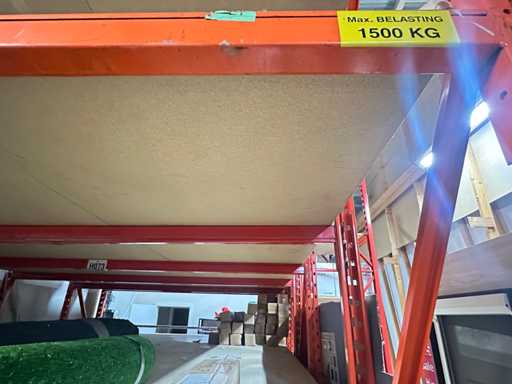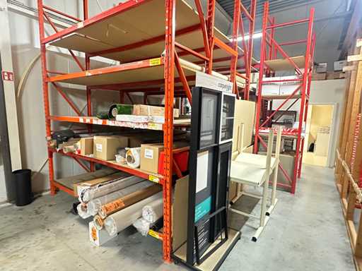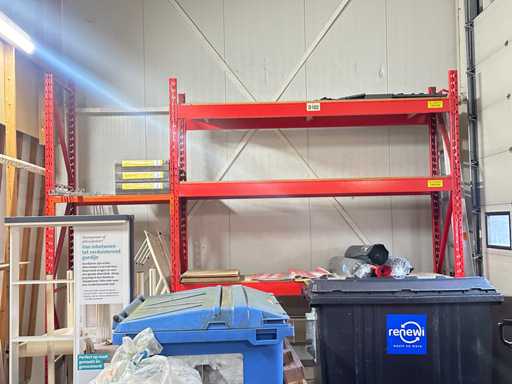 Deze stelling bestaat uit 11 staanders van 90 cm (breed), Hoogte van 320 cm tot 400 cm. 40 liggers met diverse afmetingen. Inclusief legborden. Exclusief inhoud.