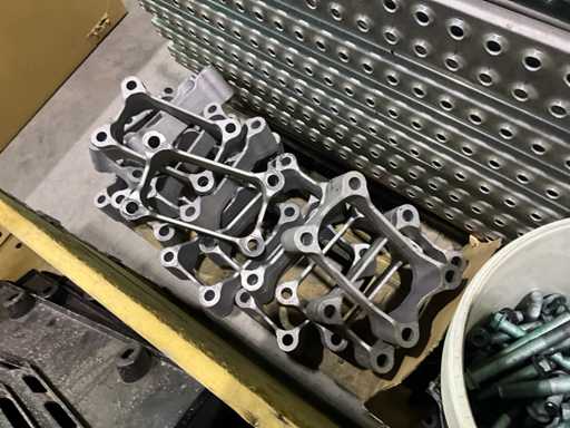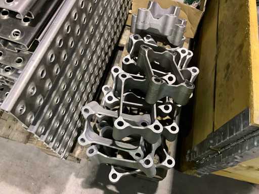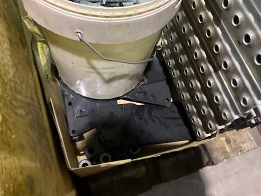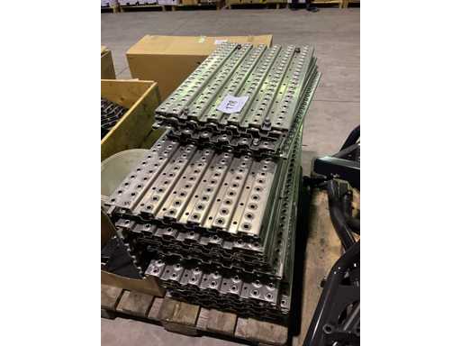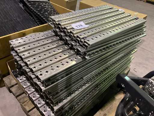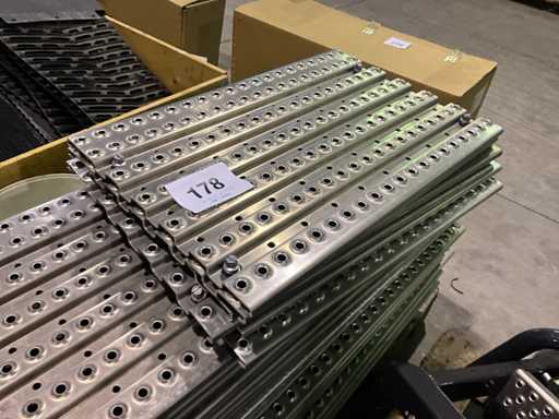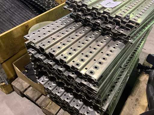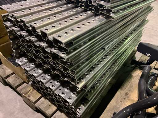 Waaronder voornamelijk loopplaten van 103 cm lang (28 stuks) compleet met 6 exemplaren van 65 cm lang en enige steunen voorzien van bijhorende bouten en moeren (samen op 1 pallet)
