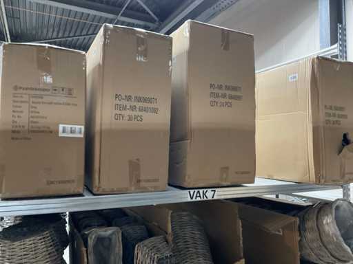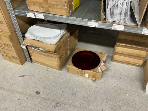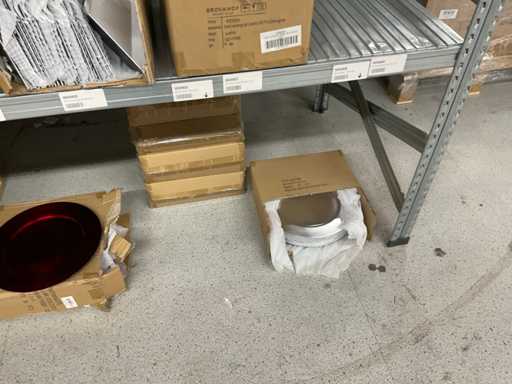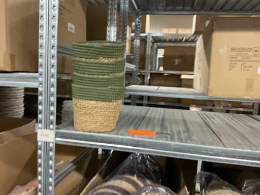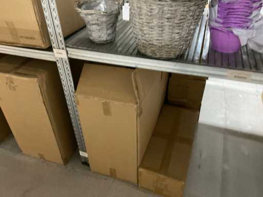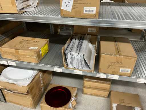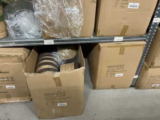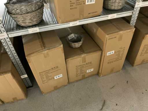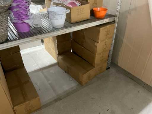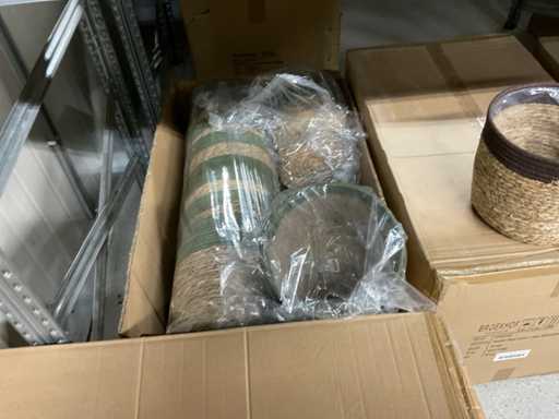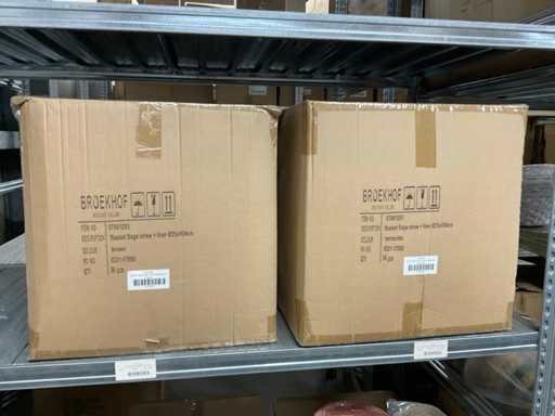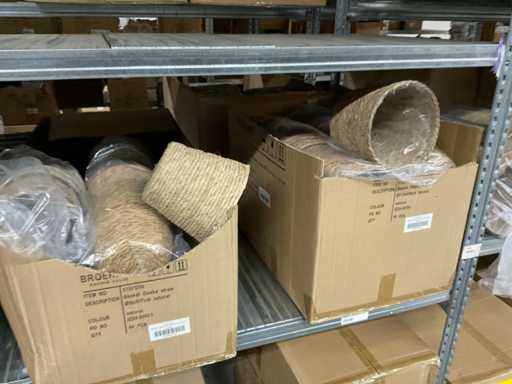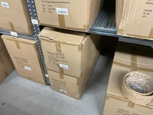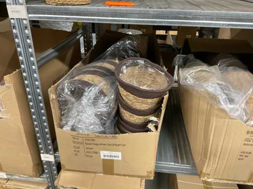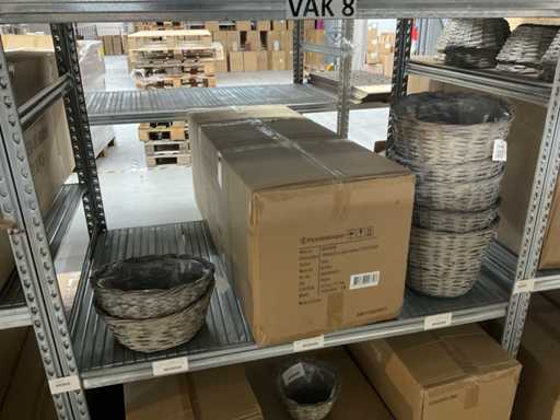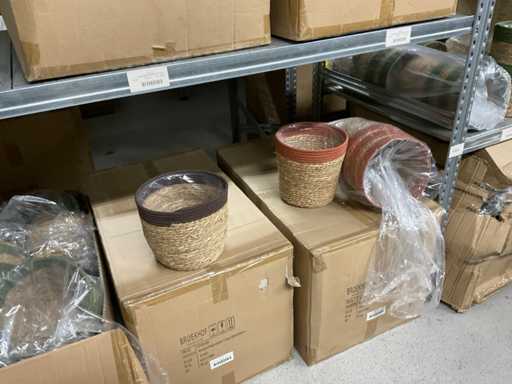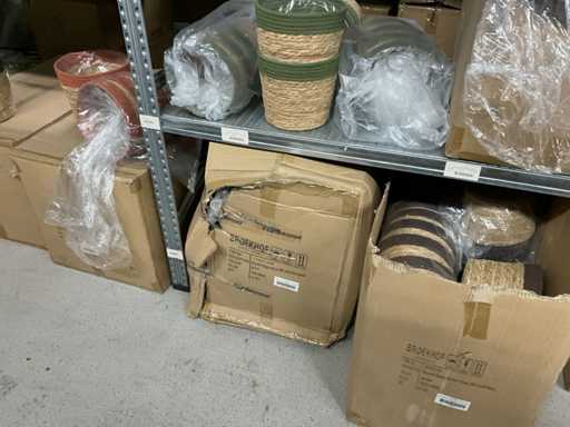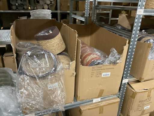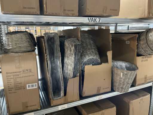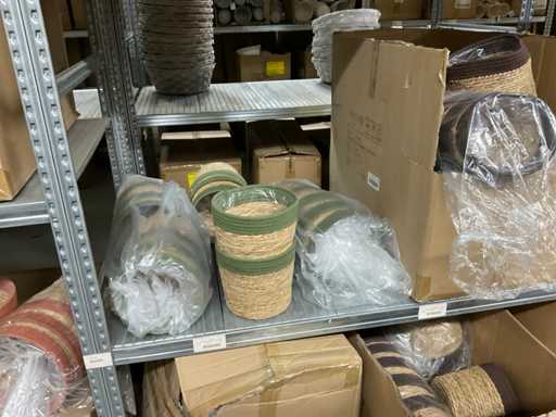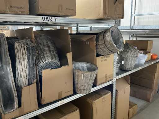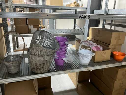 Bestaande uit inhoud beide zijde stelling, manden in diverse kleuren, formaten en vormen, inclusief borden en schalen, exclusief stellingen.