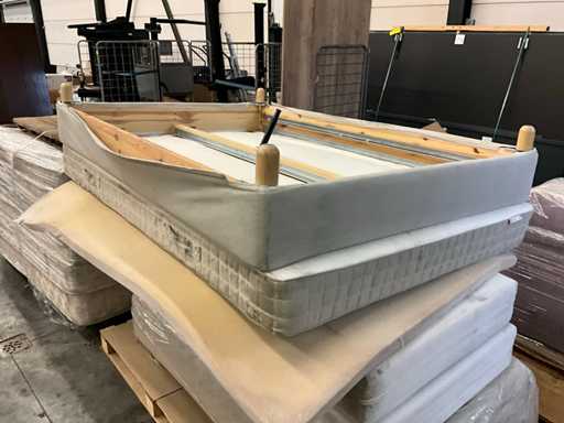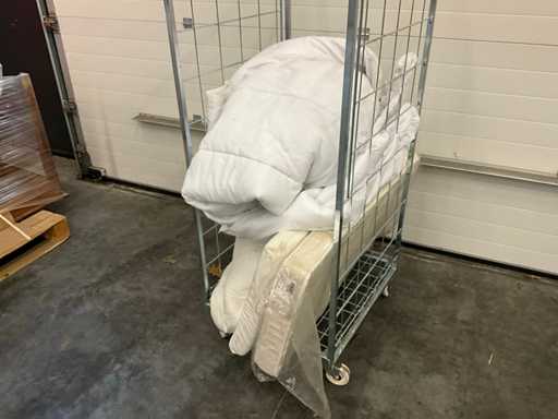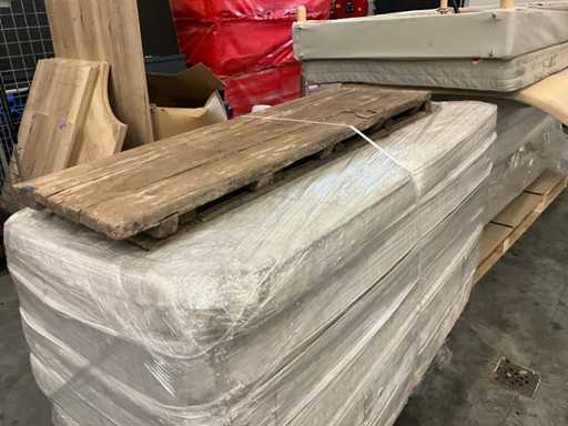 8x 200x90cm, 1x boxspring met matras 200x90cm, 1x Ikea Hafslo 200x120cm, 2x Tapi 200x90cm, 1x tafel 700x2600 6x poot, diverse dekens en kussens, rolkar niet inbegrepen