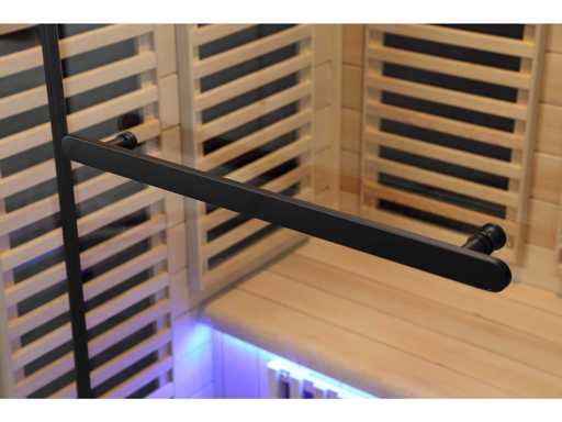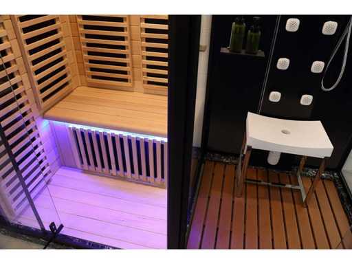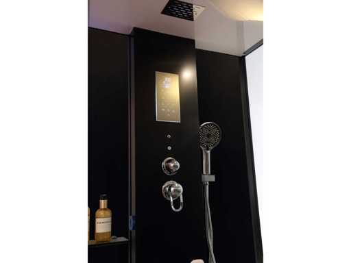 8mm veiligheidsglas, marmer bodem met PVC anti slip inleg (in stoomgedeelte) , digitaal bedieningspaneel (in zowel de sauna als het stoomcabine gedeelte), bluetooth met speakers, afvoer met flexibele waterslang, sauna deel 5 infrarood panelen totaal 3500 watt, stoomgenerator 2500 watt, totale stroom 220v 6000 watt 16a(met plug and play stekkers), 6 stuks massagejets in de achterwand verwerkt, afstandsbediening, sauna gedeelte bestaat uit hemlock hout. bankje geschikt voor 2 personen, thermometer sauna, diverse ledverlichting met kleurentherapie (7 kleuren), stoomcabine voorzien van design zitje, rvs deurgrepen (goud), aromatherapie, digitale temperatuur aanduiding, afzuiging met ventilator, ozone, waterdruk regelbaar, handdouche, planchet, verchroomd messing kraanwerk, 2 draaideuren met massieve RVS (gouden) ophangingen, regendouche in het plafond, handdouche