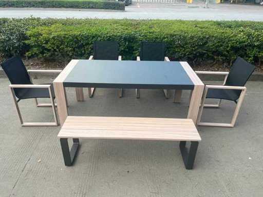 nieuwe Tuinset aluminium met stoelen en bank Stoel: W59*D59.5*H90cm Bank :L145*W37*H43cm Tafel: L183*W90*H74cm Complete 5-persoons tuinset: 3 stoelen, 1 zitbank en 1 tafel. Luxe uitstraling door het zwarte metaal en de bruine houtafwerking. Comfortabele zitplaatsen voor een aangename buitenervaring. Stevige en duurzame constructie voor langdurig gebruik. Ruime tafel met houtlook blad voor diners en gezelligheid. Modern en tijdloos design dat in elke tuin past.