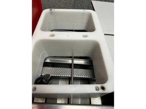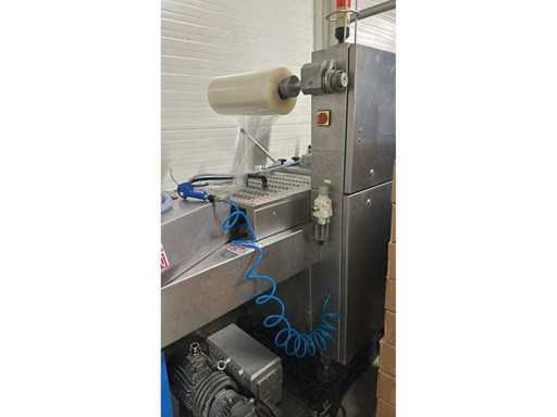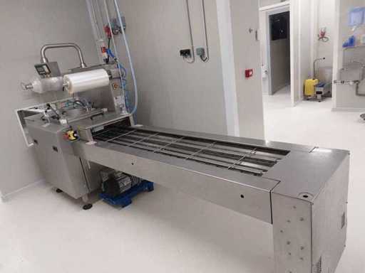 MECA S2003 traysealer met accumulatietafel Uitgerust met een Busch-vacuümpomp MACHINE EN VOLLEDIG GEREVISEERD EN KLAAR OM TE GEBRUIKEN -Werkt in MAP-modus (Modified Atmosphere Locking) -Vacuüm -Eenvoudige deksel Veel onderdelen vervangen (vacuümpomp, hete plaat, messen, gereedschapsafdichtingen, kettingaandrijfmotor, tray-positioneringssensoren, kettingsensoren, elektronische printplaten, gasinlaatsysteem, luchtinlaatsysteem met complete klep, filmafwikkelingsmotor) Het trayformaat is B6 18/25 in onbeperkte diepte. Je kunt PP- en EPS-trays gebruiken. Filmbreedte is 450 mm. Gewicht ca. 850 kg. Lengte in 4m20. Afneembaar in 2 delen voor transport. De gebruikershandleiding wordt bij de machine geleverd.