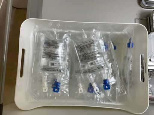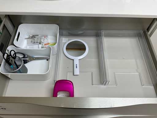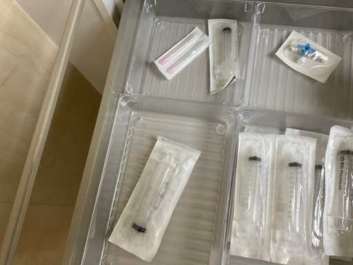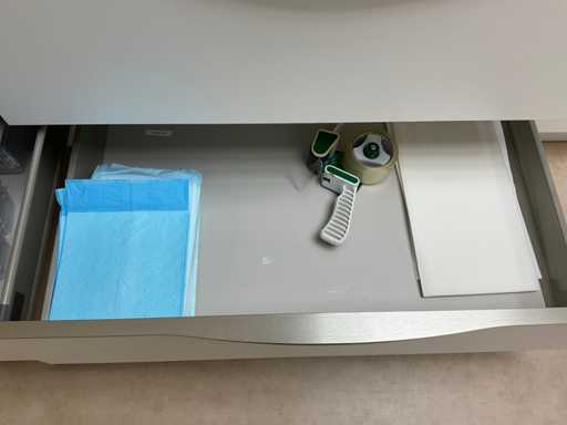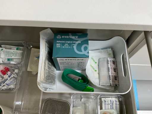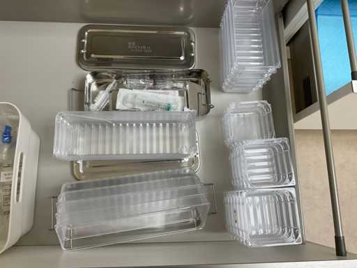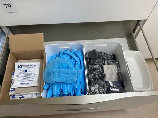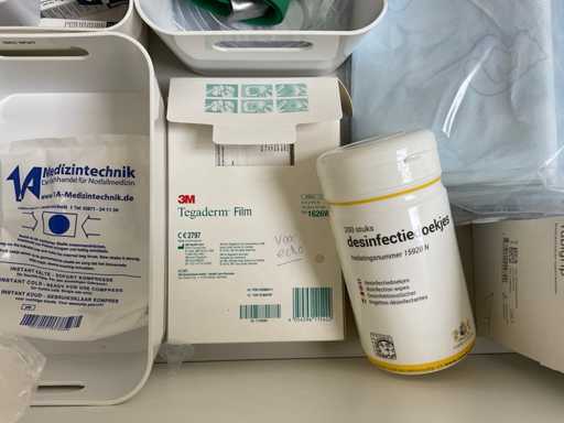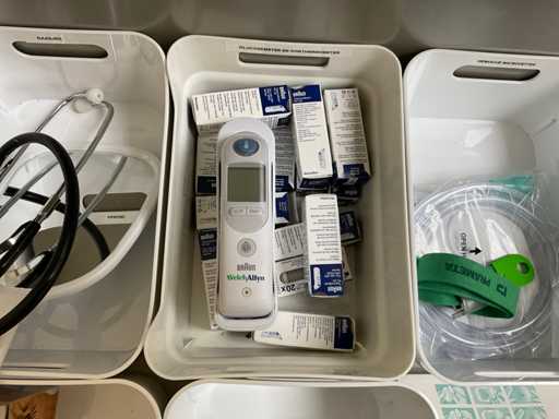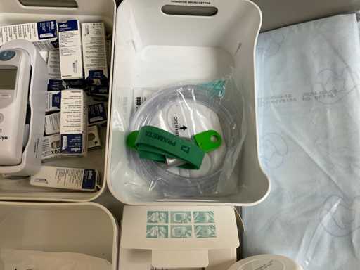 Inhoud lades bestaande o.a. uit spoelspuiten, driewegkraan, injectienaalden, oorthermometer, stethoscoop en oplossing voor infusie.