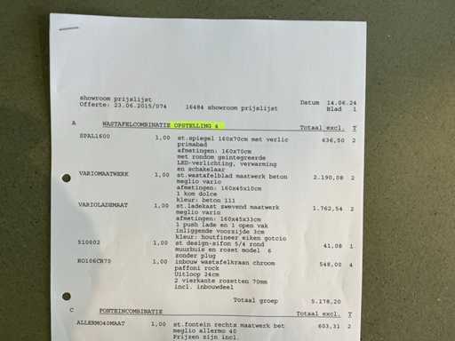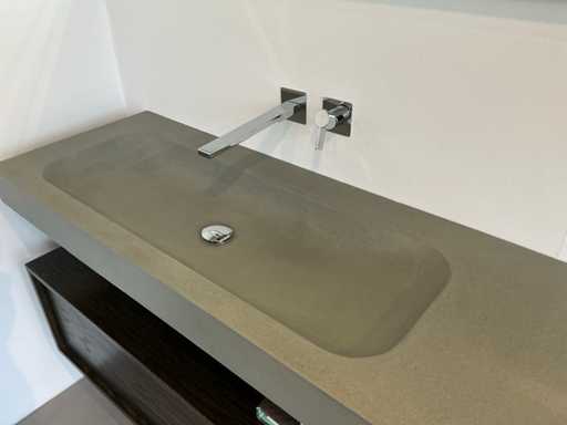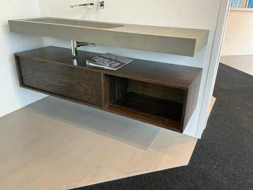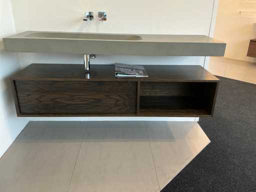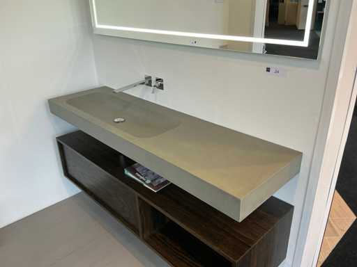 Bestaande uit maatwerk beton wastafelblad (160x45x10cm) met 1 kom Dolce, voorzien van Paffoni Rock wastafelkraan (opbouwgedeelte), maatwerk zwevende onderkast 160x45x33cm kleur houtfineer eiken gotcio, Primabad spiegel met verlichting en verwarming.