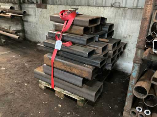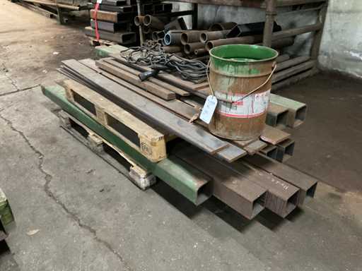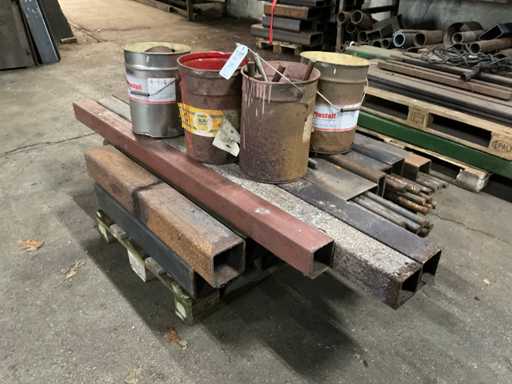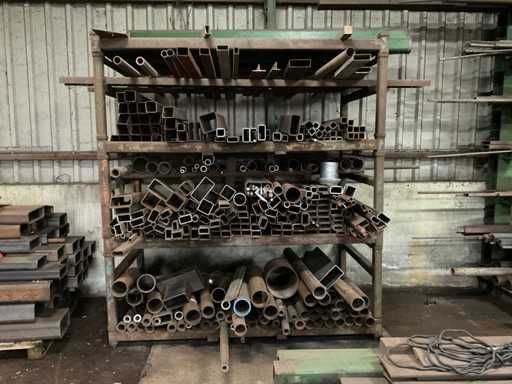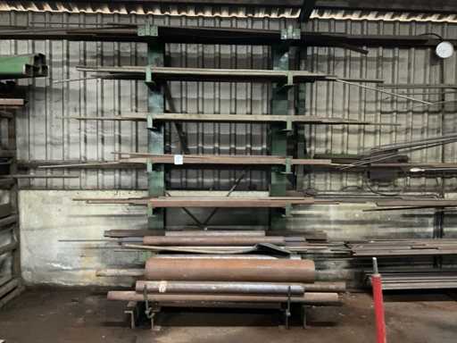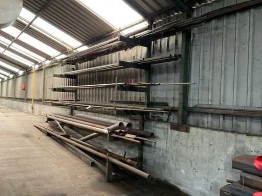 Betreft inhoud 3x 6 etages 1-zijdige draagarmstelling, waaronder buizen, rondstaal, kokers, T-profiel, 3x pallet met restanten, 1x stelling met restanten kokers en buizen, etc