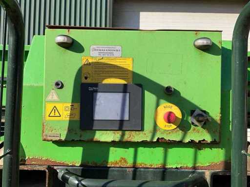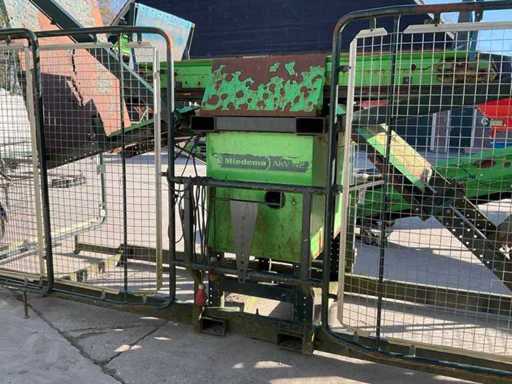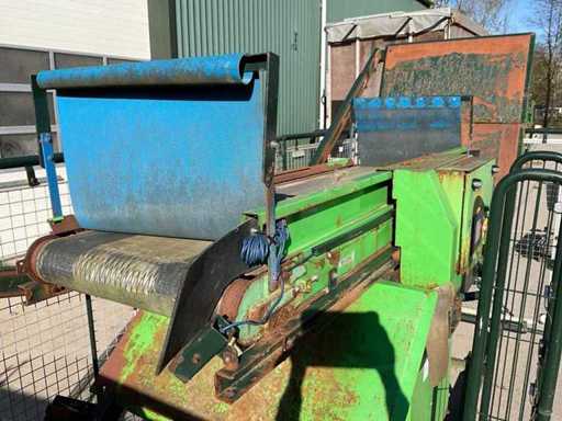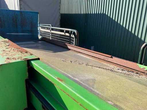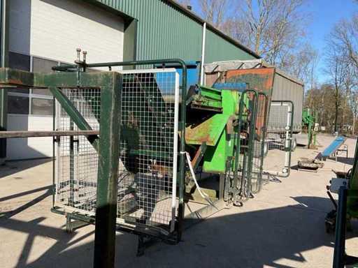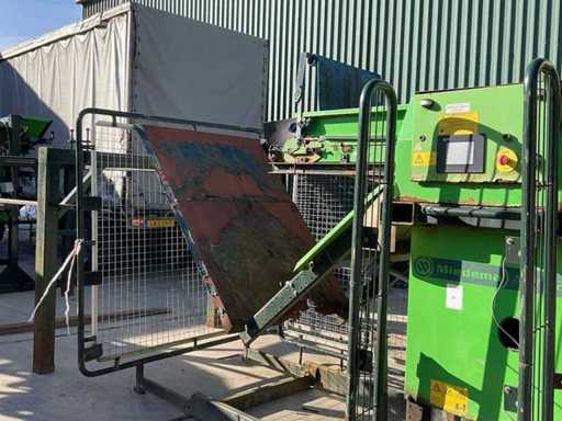 cap. ca. 40 ton per uur; kisten maat 1200x1600 mm; v.v. horizontale transportband; band afm. ca. 2400x700 mm