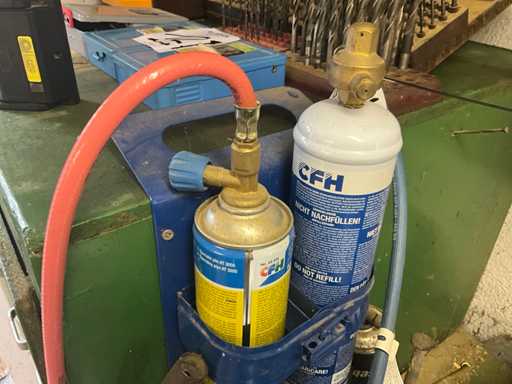 Met brander en diverse gasflessen, gewicht geschat op ongeveer 5 kg,