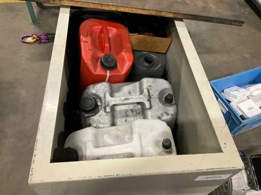 Voorzien van onderuitloop en houten werkblad met diverse olie en smeermiddelen