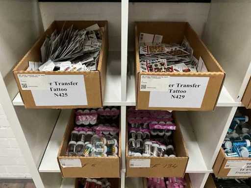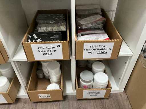Betreft de inhoud van vakkenkast, bestaande uit onder andere: nail decorations, water transfer tattoos, transfer foil, nail tips, acrylpoeder en Ardell wenkbrauw pomade