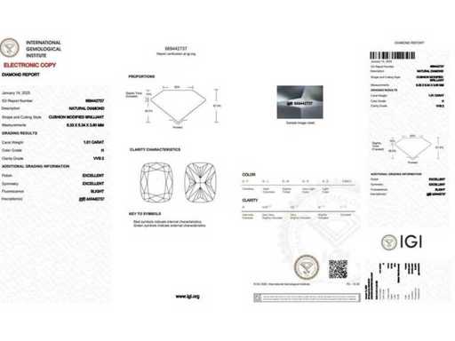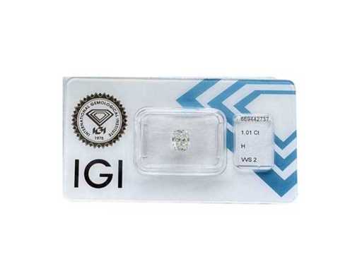 Natural Diamond 1.01 karaat 2EX, TOP kleur H, zeer goede helderheid VVS2 in dempingsvorm. Het is een beleggingsdiamant met Exellent polish et Exellent symmetrie. Gecertificeerd door IGI, een van de grootste onafhankelijke certificerings- en evaluatieinstituten voor edelstenen ter wereld. Meer informatie over het certificaat. De foto's zijn genomen met een lens van hoge kwaliteit. Geen kleurretoucheerproces. Schattingsprijs van de winkel: € 13.450.-