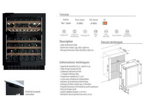 - Cave à vin Frecan neuf, sous plan, capacité de 45 bouteilles, 595 x 820 x 580 mm