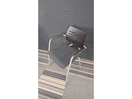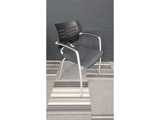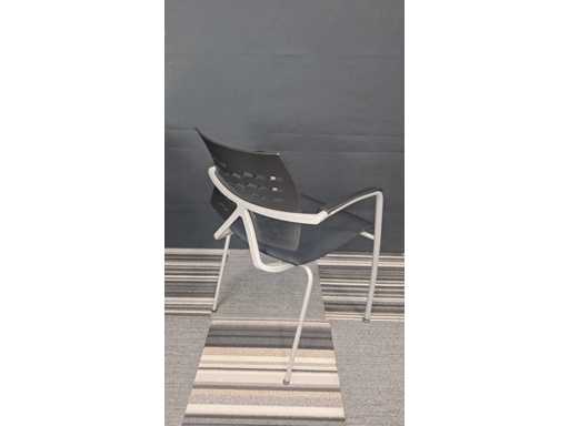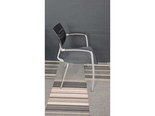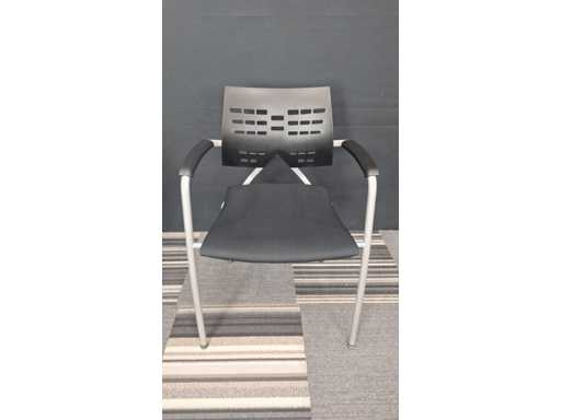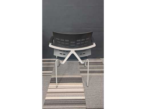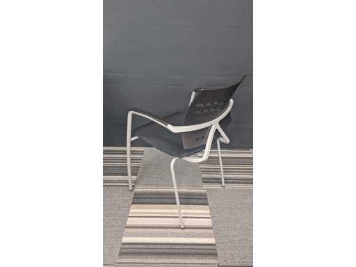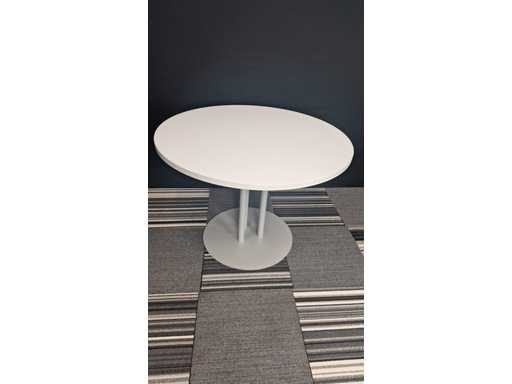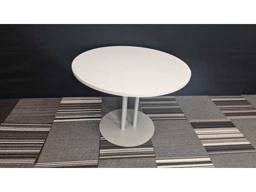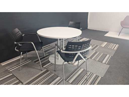 1 vergadertafel met centrale poot in metaal kleur Alu, werkblad in melamine kleur Wit, diameter 800 mm, hoogte 730 mm + 3 x bezoekersstoel, vierpoots onderstel in metaal kleur Alu, zitting bekleed met stof kleur Zwart, rugleuning in kunststof kleur Zwart, armleuningen in kunststof kleur Zwart, zeer goede staat