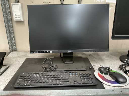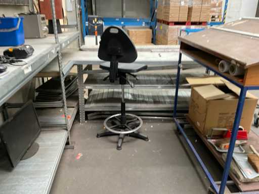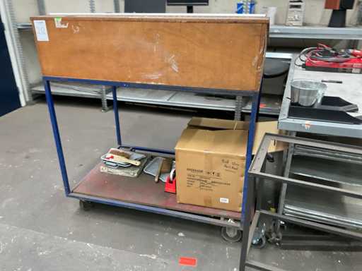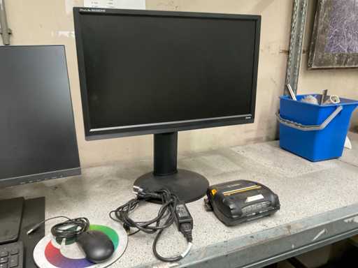 Bestaande uit stelling met inhoud w.o. Zebra printer, monitor, baliedeel, lessenaar met inhoud.