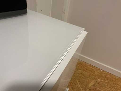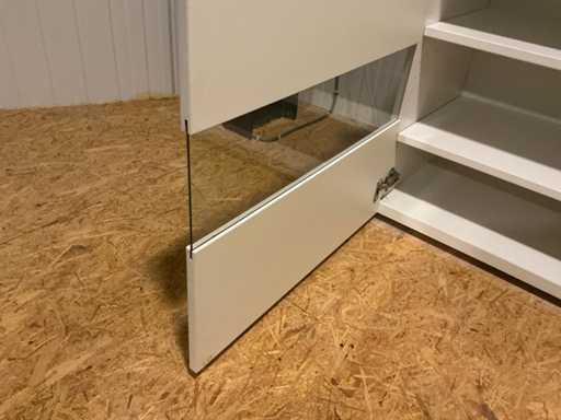 Voorzien van 3 deuren, glazen topblad en diverse leggers, zonder inhoud