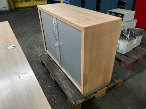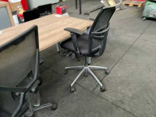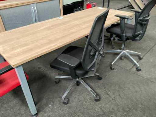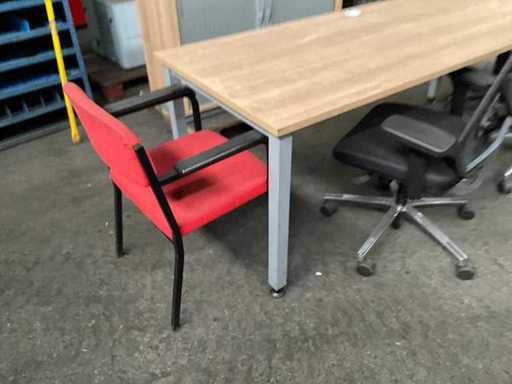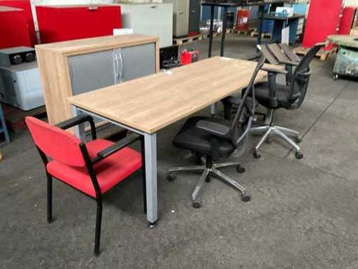 Bestaande uit 1ctafel, 2 bureaustoelen waarvan 1 een wiel mist, krukje, vergaderstoel en kast.