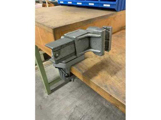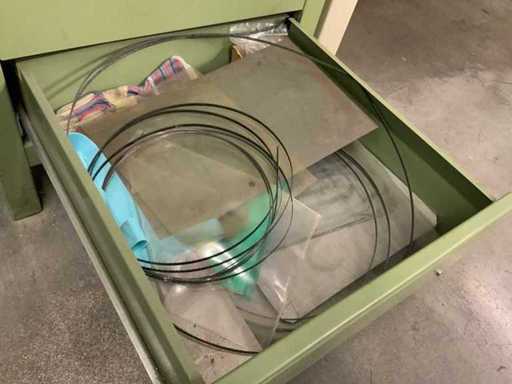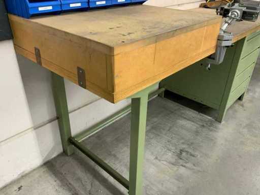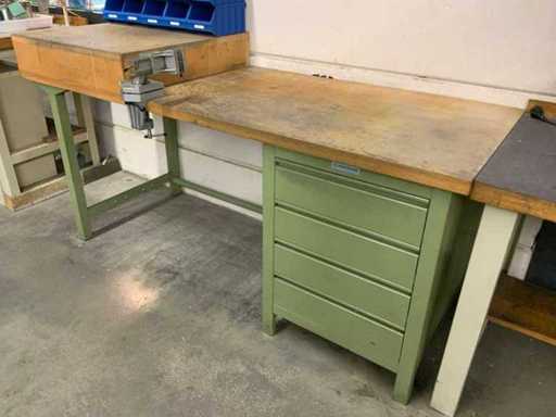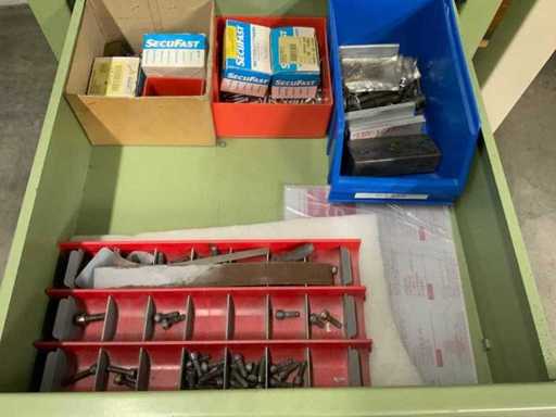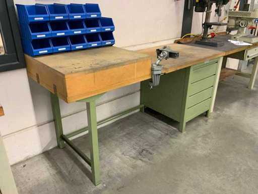 Voorzien van 4 laden met inhoud, bankschroef, houten opbouw en 14 kunststof grijpvoorraad bakken