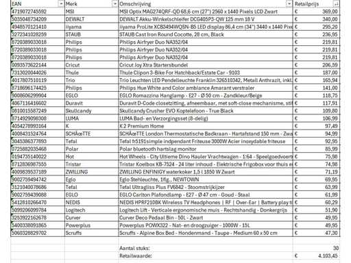 Dit betreft een partij A-merk retourgoederen van een grote online retailer. De partij bestaat uit diverse productcategorieën. Aantal stuks: 30. Retailwaarde: €4103,- Ongecontroleerd: werking onbekend (mix van