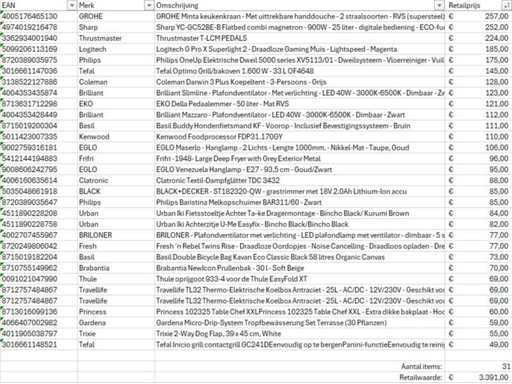 Dit betreft een partij A-merk retourgoederen van een grote online retailer. De partij bestaat uit diverse productcategorieën. Aantal stuks: 31. Retailwaarde: €3391,- Ongecontroleerd: werking onbekend (mix van