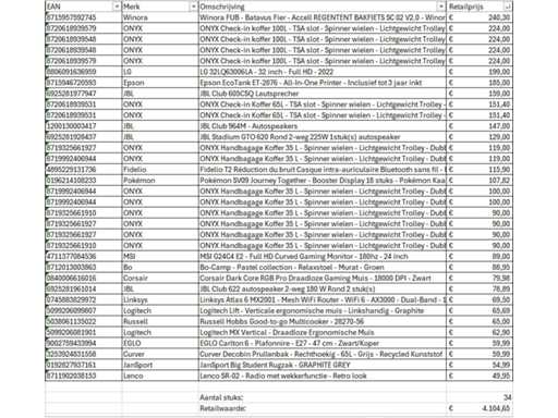 Dit betreft een partij A-merk retourgoederen van een grote online retailer. De partij bestaat uit diverse productcategorieën. Aantal stuks: 34. Retailwaarde: €4105,- Ongecontroleerd: werking onbekend (mix van