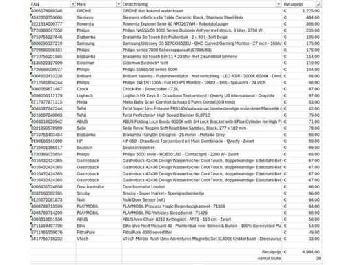 Dit betreft een partij A-merk retourgoederen van een grote online retailer. De partij bestaat uit diverse productcategorieën. Aantal stuks: 36. Retailwaarde: €4994,- Ongecontroleerd: werking onbekend (mix van