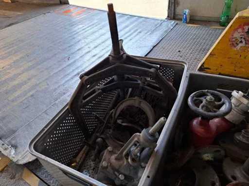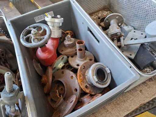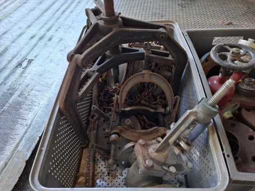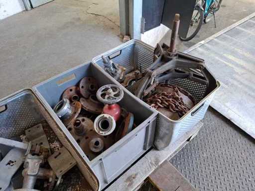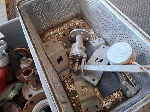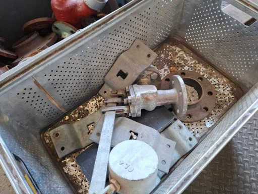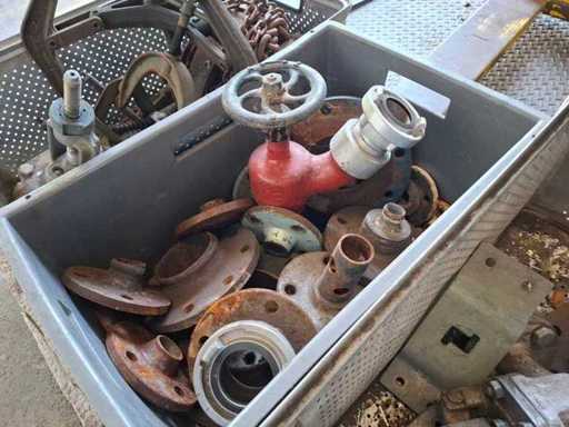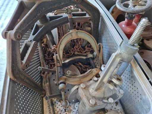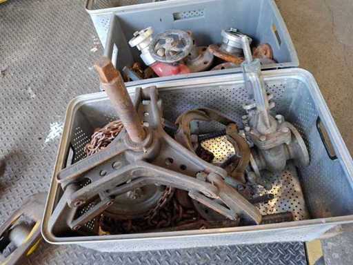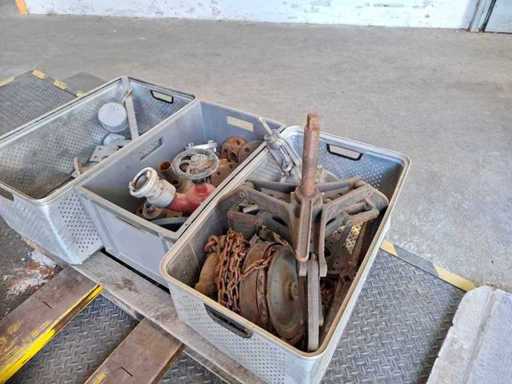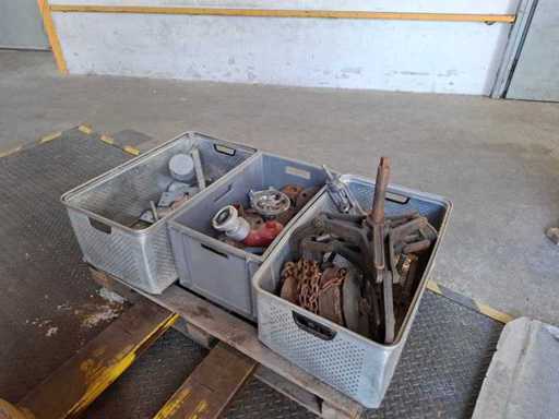Pallet met verschillende kleppen, trekker, kettingtakel en accessoires