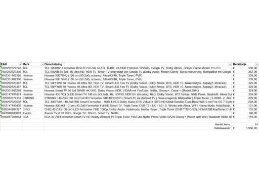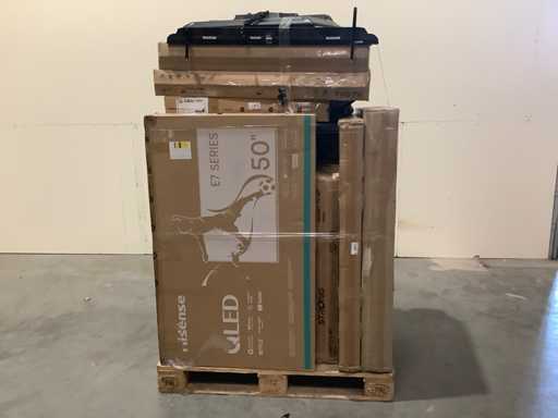 Dit betreft een partij televisies retourgoederen van een grote online retailer. De partij bestaat uit diverse diverse maten televisies. Aantal stuks: 14. Retailwaarde: €3966,- De televisies zijn niet werkend en zijn te gebruiken voor onderdelen. Kom op de kijkdag om te om zo een goed beeld te krijgen van de reden van retour. Zie foto's voor lijst met inhoud.
