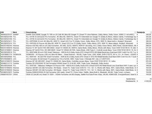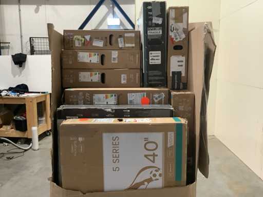 Dit betreft een partij televisies retourgoederen van een grote online retailer. De partij bestaat uit diverse diverse maten televisies. Aantal stuks: 19. Retailwaarde: €4520,- De televisies zijn niet werkend en zijn te gebruiken voor onderdelen. Kom op de kijkdag om te om zo een goed beeld te krijgen van de reden van retour. Zie foto's voor lijst met inhoud.