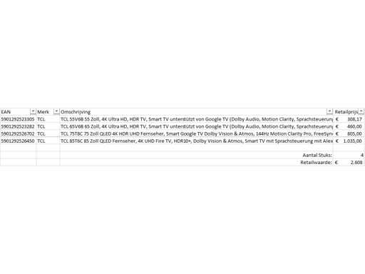 Dit betreft een partij televisies retourgoederen van een grote online retailer. De partij bestaat uit diverse diverse maten televisies. Aantal stuks: 4. Retailwaarde: €2608,- De televisies zijn niet werkend en zijn te gebruiken voor onderdelen. Kom op de kijkdag om te om zo een goed beeld te krijgen van de reden van retour. Zie foto's voor lijst met inhoud.