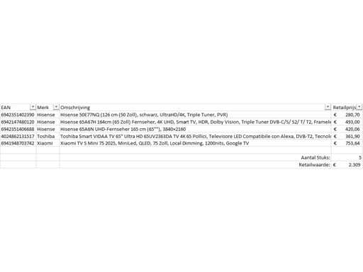 Dit betreft een partij televisies retourgoederen van een grote online retailer. De partij bestaat uit diverse diverse maten televisies. Aantal stuks: 5. Retailwaarde: €2309,- De televisies zijn niet werkend en zijn te gebruiken voor onderdelen. Kom op de kijkdag om te om zo een goed beeld te krijgen van de reden van retour. Zie foto's voor lijst met inhoud.