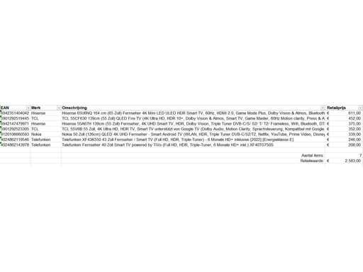 Dit betreft een partij televisies retourgoederen van een grote online retailer. De partij bestaat uit diverse diverse maten televisies. Aantal stuks: 7. Retailwaarde: €2583,- De televisies zijn niet werkend en zijn te gebruiken voor onderdelen. Kom op de kijkdag om te om zo een goed beeld te krijgen van de reden van retour. Zie foto's voor lijst met inhoud.