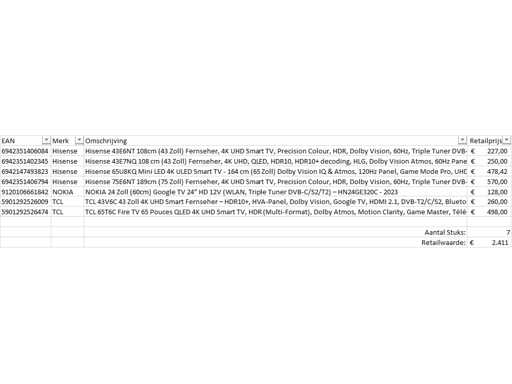 Dit betreft een partij televisies retourgoederen van een grote online retailer. De partij bestaat uit diverse diverse maten televisies. Aantal stuks: 7. Retailwaarde: €2411,- De televisies zijn niet werkend en zijn te gebruiken voor onderdelen. Kom op de kijkdag om te om zo een goed beeld te krijgen van de reden van retour. Zie foto's voor lijst met inhoud.