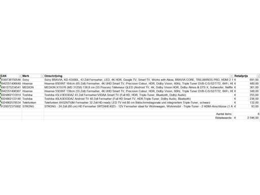 Dit betreft een partij televisies retourgoederen van een grote online retailer. De partij bestaat uit diverse diverse maten televisies. Aantal stuks: 8. Retailwaarde: €2596,- De televisies zijn niet werkend en zijn te gebruiken voor onderdelen. Kom op de kijkdag om te om zo een goed beeld te krijgen van de reden van retour. Zie foto's voor lijst met inhoud.