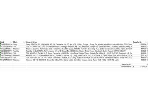 Dit betreft een partij televisies retourgoederen van een grote online retailer. De partij bestaat uit diverse diverse maten televisies. Aantal stuks: 8. Retailwaarde: €4.208,- De televisies zijn niet werkend en zijn te gebruiken voor onderdelen. Kom op de kijkdag om te om zo een goed beeld te krijgen van de reden van retour. Zie foto's voor lijst met inhoud.