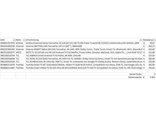 Dit betreft een partij televisies retourgoederen van een grote online retailer. De partij bestaat uit diverse diverse maten televisies. Aantal stuks: 9. Retailwaarde: €2367,- De televisies zijn niet werkend en zijn te gebruiken voor onderdelen. Kom op de kijkdag om te om zo een goed beeld te krijgen van de reden van retour. Zie foto's voor lijst met inhoud.