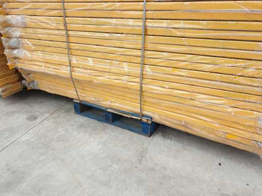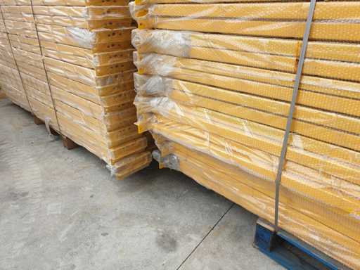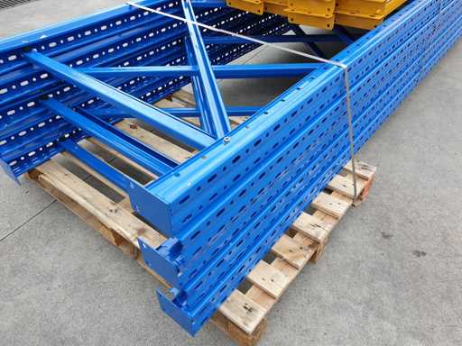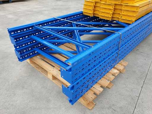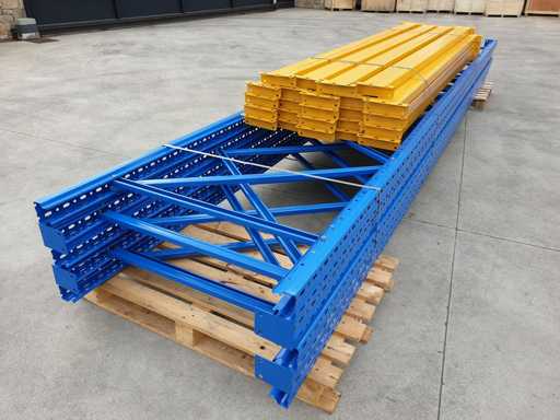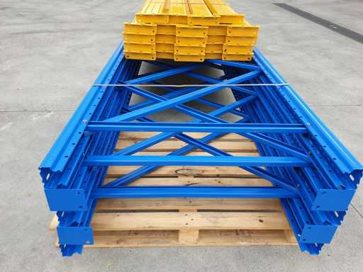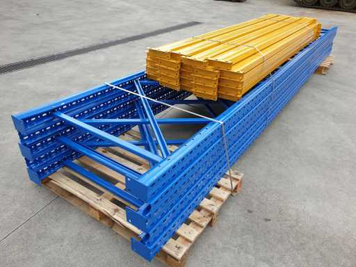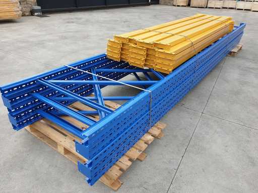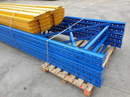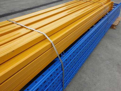 Set met palletrekken voor een lengte van 11 meter, set bestaande uit 5 schouders van 5000 x 1000 mm + 24 balken van 2700 mm lang in geel met een capaciteit van 2500 kg per verdieping, de planken worden geleverd in de originele verpakking, al gedemonteerd en klaar op pallets