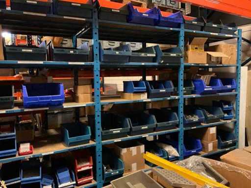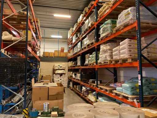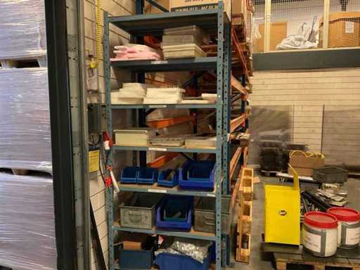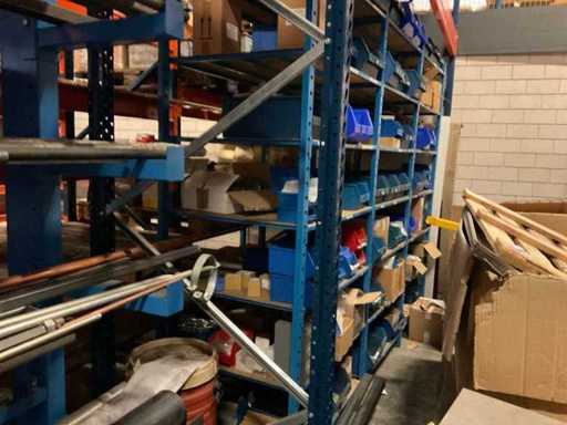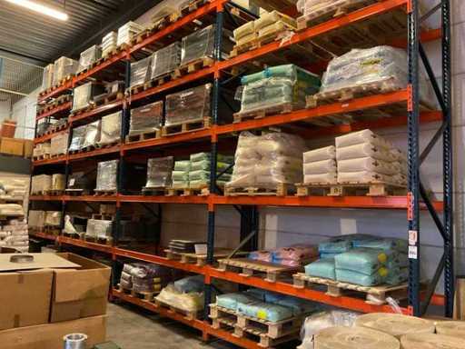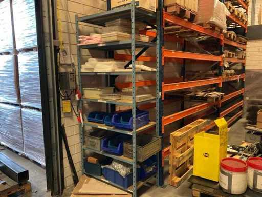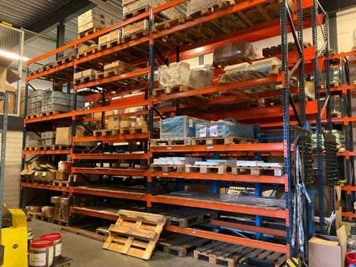 Kavel betreft de grote oranje/ blauw kleurige stelling, alsmede 3 kleinere blauwe stellingen onder en voor de grote stelling, waarvan één met draagarmen. Inhoud van alle stellingen en zichtbare pallets zijn niet inbegrepen.