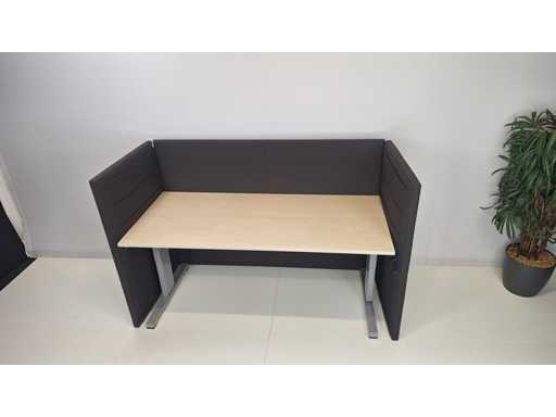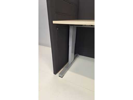 bureau Pami, in hoogte verstelbaar (620 - 820 mm) onderstel in metaal kleur Alu, blad in melamine kleur Ahorn, akoestisch privacy scherm bekleed met stof kleur Antraciet, in zeer goede staat