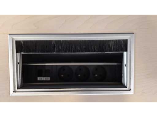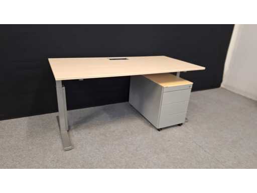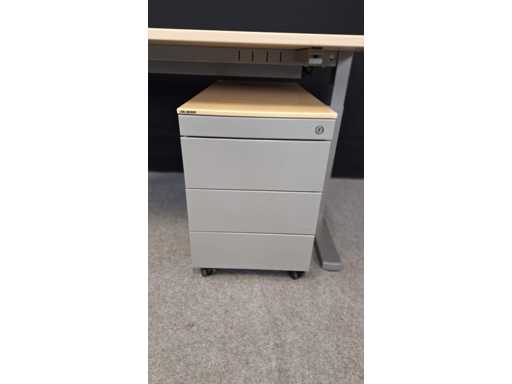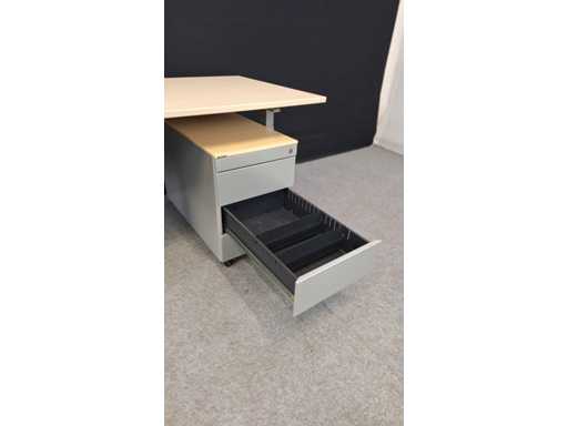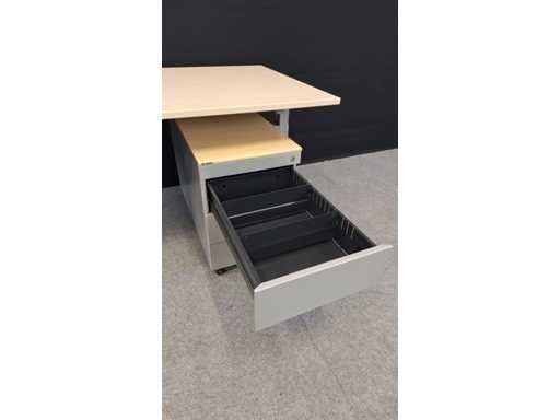 Onderstel in metaal kleur Aluminium, blad in melamine kleur Ahorn voorzien van elektrificatie, goede staat, inclusief mobiel ladenblok TDS in metaal kleur alu, uitgerust met 3 lades + pennenlade en top in melamine, lichte gebruikssporen mogelijk, sleutel ontbreekt