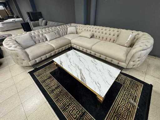 Salon paris afmeting: 310x260cm kleur: beige stof, zilver details; staat: showroom model