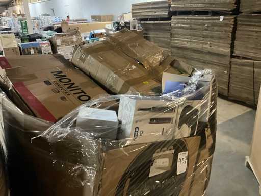 Bestaande uit 1x europallet met diverse Amazon retourgoed, circa 1.8 m hoog gestapeld.