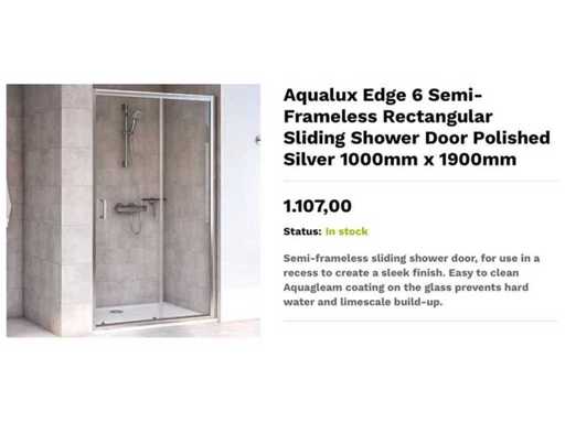 Partij Aqualux douchedeuren 100cm x 190cm x 6mm. 10 stuks. Nieuw in doos. 1 pallet