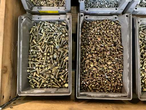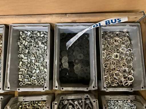 Bestaande uit 10 kunststof magazijnbakken met diverse bevestigingsmaterialen